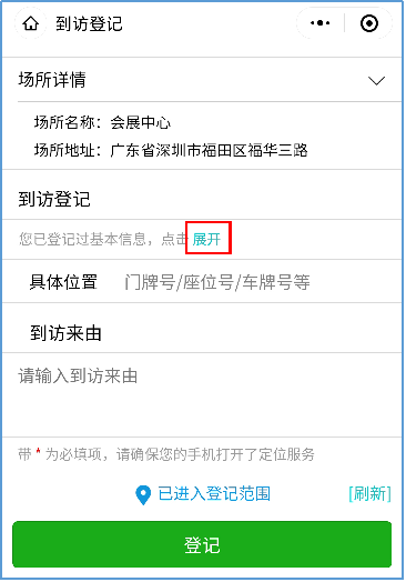 l 首次扫码后出现以上界面(图1),点开红框中的展开,在红框中输入个人资料(图2);